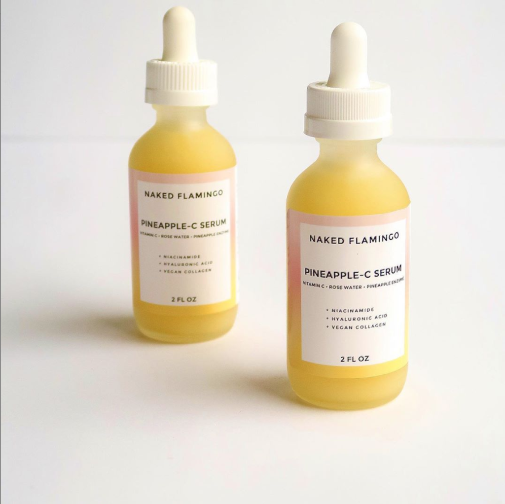 Their Pineapple-C serum is formulated with Vitamin-C, rose hip seed oil, aloe vera, pineapple enzyme (Bromelain), Niacinamide, & hyaluronic acid. (organic, plant-based, & cruelty-free)